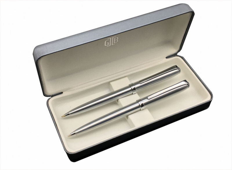 Sada OLIVETA v matné stříbrné barvě s lesklými detaily, se skládá z mikrotužky a kuličkového pera se stiskacím mechanismem v jednoduchém designu. Šedá krabička GB s bílou výstelkou.