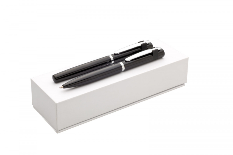 Elegantní dárková sada s propiskou a rollerem v bílé krabičce se značkou GABRIELIS. Tužky mají otočný mechanismus, roller odnímatelné víčko. Povrch tužek leskle modrý se stříbrným klipem v černém úchytu.