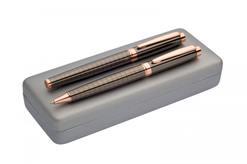 Elegantní dárková sada s propiskou a rollerem v šedé krabičce se značkou GABRIELIS. Tužka má otočný mechanismus, roller odnímatelné víčko. Povrch tužek je grafitově šedý s doplňky v moderní barvě rosengold.
