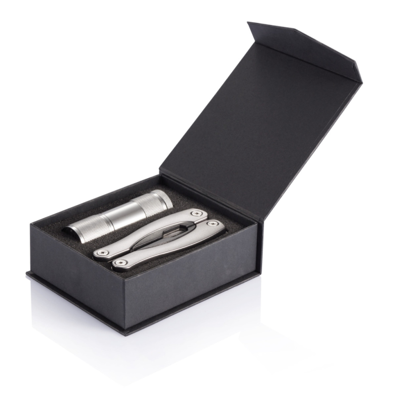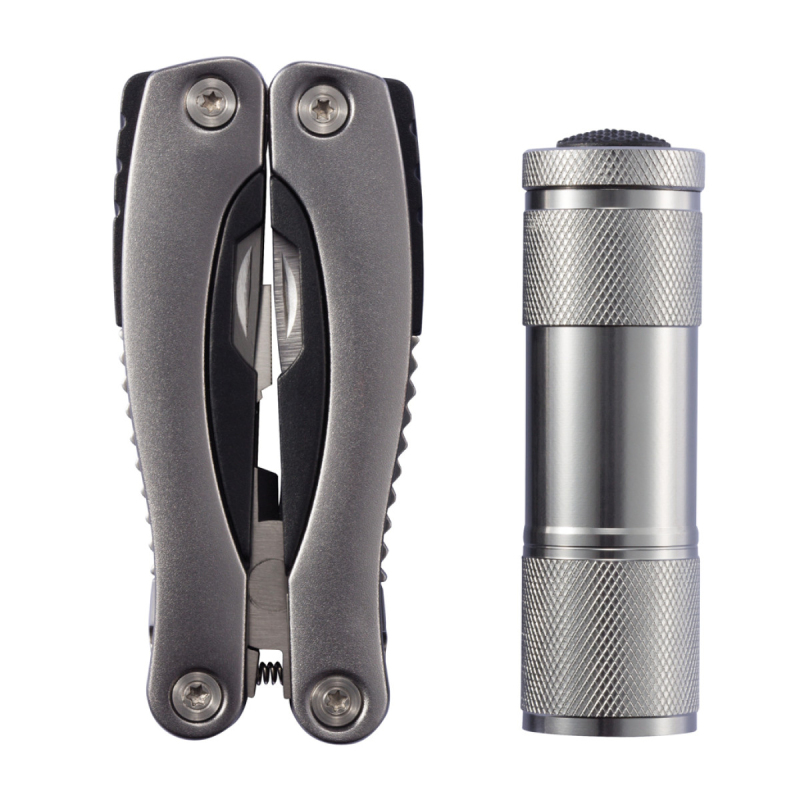 Multifunkční nůž se 14 funkcemi z nerez oceli s rukojetí z eloxovaného hliníku a hliníkovou svítilnou s 9 bílými LED žárovkami.