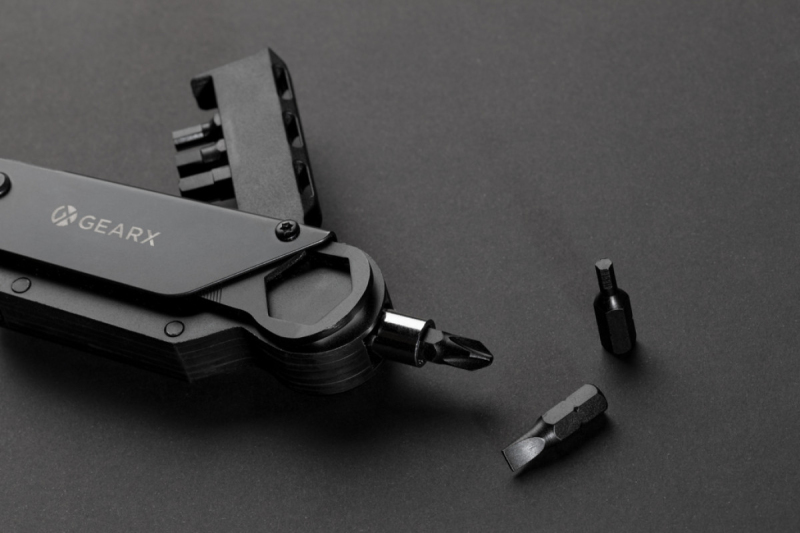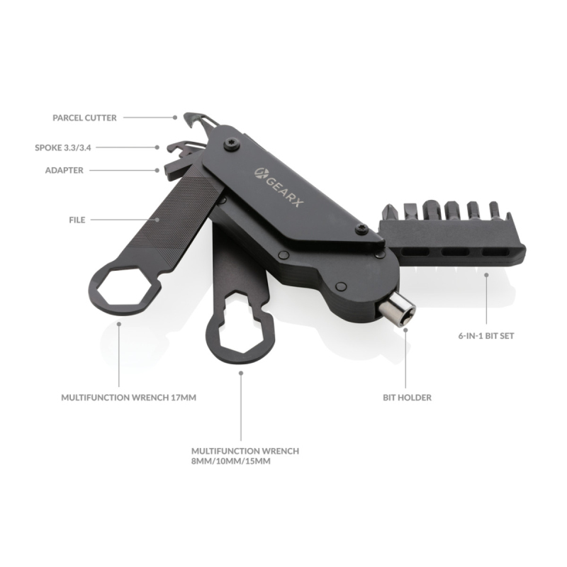 Luxusní multifunkční nástroj na opravu kola. Tělo vyrobené z luxusního hliníku, nástroje a čepel z prémiové 420 nerezavějící oceli pro dlouhou životnost. Vše v černém odstínu. Disponuje celkem 16 funkcemi: rukojeť na bity, integrovaný držák na bity (S2.5, S2 5mm, S2 4mm, S3 3mm, S2 6mm, S2 PH2), klíč na paprsky kola (3.4/3.3), nůž na balíky, adaptér, multifunkční klíč se zámkem (18mm), druhý multifunkční klíč se zámkem (15/10/8mm), pilník. Baleno v luxusní dárkové krabičce. Tvrdost nástrojů: 40-45 HRC. Tvrdost bitů: 60-62 HRC.