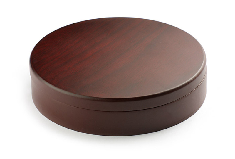Praktický 4 ks sada na víno v kulaté dřevěné krabici. Sada obsahuje číšnický nůž, dva uzávěry ozdobené korkovou zátkou a láhevní pás. Logo může být vyryto přímo na krabici nebo na kovové desce, která může být přilepena na krabici.