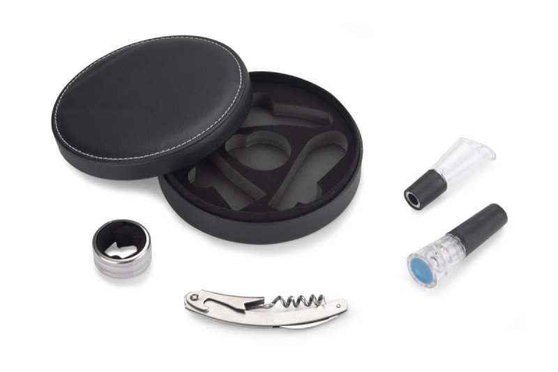 Tento elegantní čtyřdílný sada na víno je balena v krabici dokončené PVC kůží. Sada obsahuje: vákuovou uzávěr, aerátor pourer, otevírač a láhev popruh. Vákuová uzávěr s vysavačem vám umožní vysát vzduch z láhve a tím uchovat víno po delší dobu bez ztráty jeho cenných vůní. Aerátor pourer aeruje víno, aby uvolnil jeho vůně.