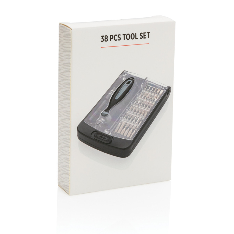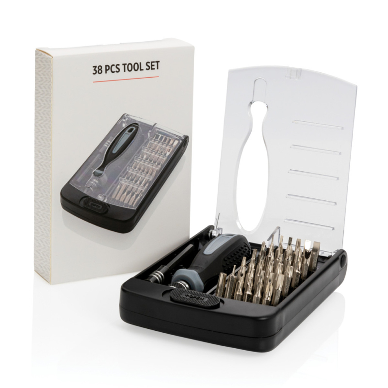 Sada 38ks nářadí s PP šroubovákem s nástavcem na bity. Bity vyrobené z karbonové oceli. Krabička z ABS s průhledným vrškem.