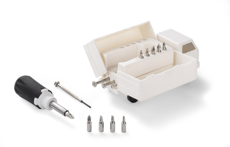 LORI je sada nástrojů v pouzdru ve tvaru kamionu. Sada obsahuje: rukojeť, čtyři přesné šroubováky a deset různých bitů.