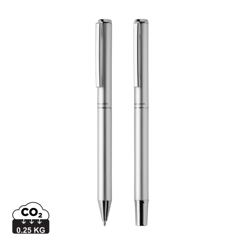 Sada per Cedar z kolekce Swiss Peak je perfektní kombinací moderního a elegantního stylu. Nejen, že skvěle vypadá, zároveň snižuje negativní dopad na životní prostředí. Obsahuje modrou náplň inkoustu Dokumental s garantovanou délkou psaní minimálně 1 200 m v případě kuličkového pera, a 400 m v případě rolleru. Vyrobená z RCS recyklovaného hliníku. RCS (Recycled Claim Standard) je globální standard, který umožňuje ověřit použití recyklovaného materiálu v produktu napříč celým dodavatelským řetězcem. Celkový podíl recyklátu dle váhy produktu: 17 %. Baleno v FSC® dárkovém obalu.