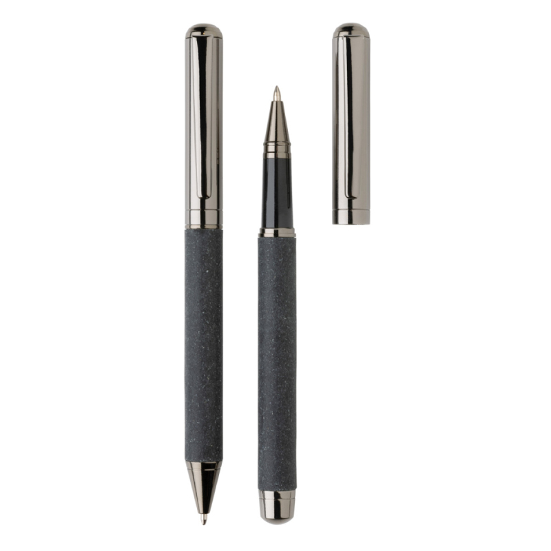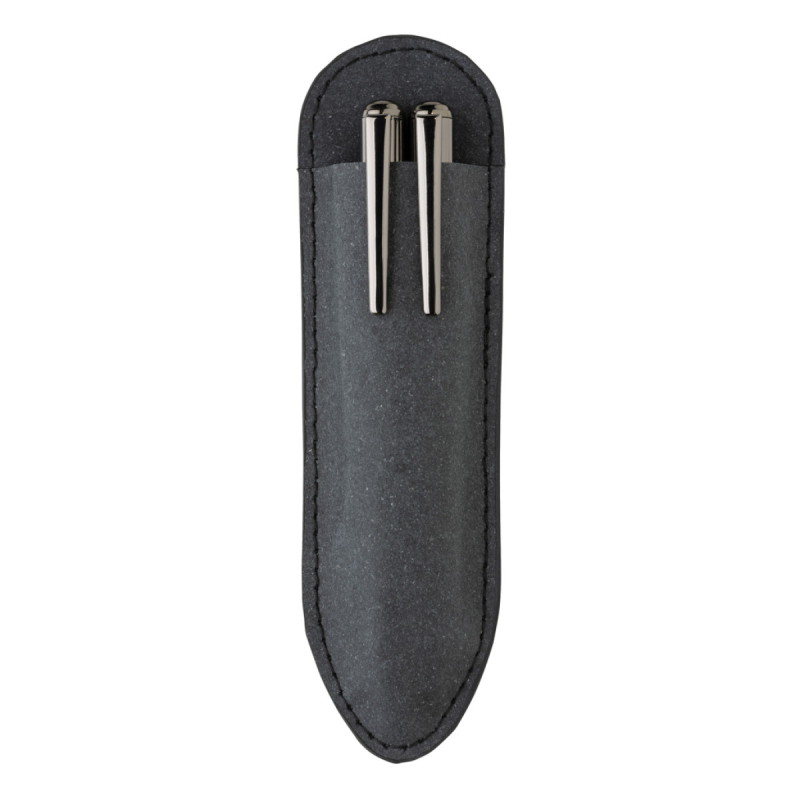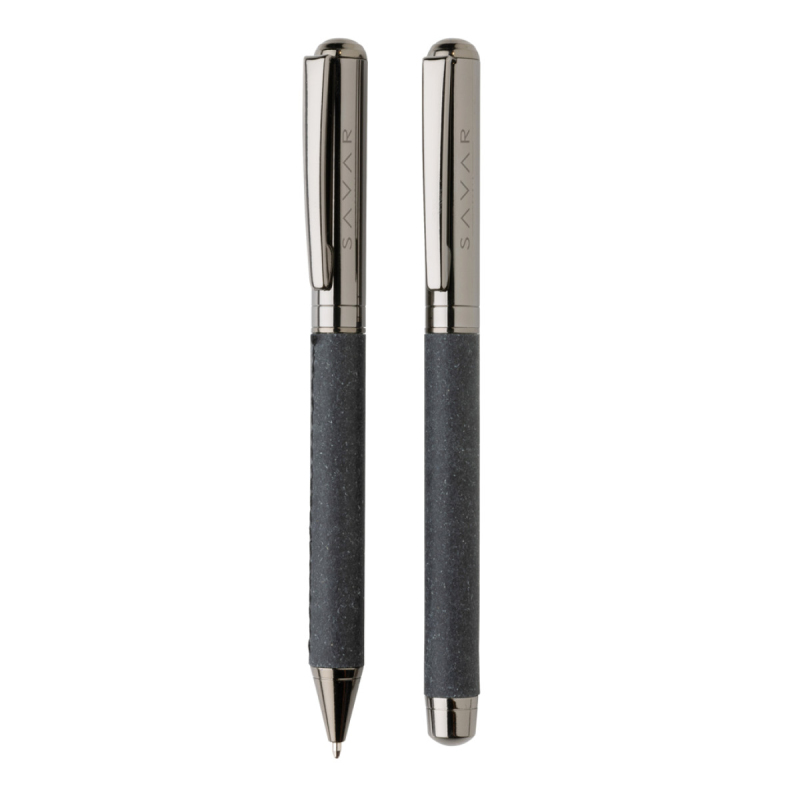 Styová sada per z recyklované kůže obsahuje jedno kuličkové pero a jeden roller. Obě pera obsahují kvalitní inkoust Dokumental v modré barvě. Délka psaní kuličkového pera: 1 200 m, rolleru: 400 m. Baleno v pouzdře z recyklované kůže a dárkové krabičce se vzorem recyklované kůže.
