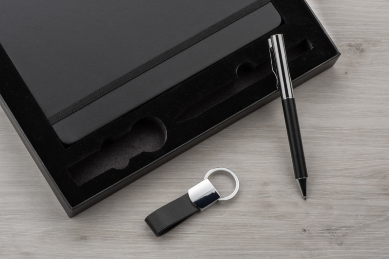 Sada PROBIZ se skládá ze zápisníku, pera a klíčenky. Zápisník má hladké stránky z kamenného papíru, formát A5. Klíčenka je vyrobena z kovu a ekokůže. Kuličkové pero s modrou náplní. Vše je zabaleno ve vkusné černé krabičce. Sada působí mimořádně elegantně.