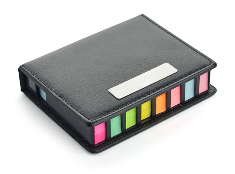 Sada nálepek v černém etui. Sada obsahuje dva bloky většího formátu a 8 malých bloků nálepek v různých barvách. Box má oddělené místo pro každý blok, takže nálepky se nemíchají. Pouzdro má prázdnou stránku pro poznámky. Logo může být vyryto na kovové desce na pouzdře. Deska není připevněna.