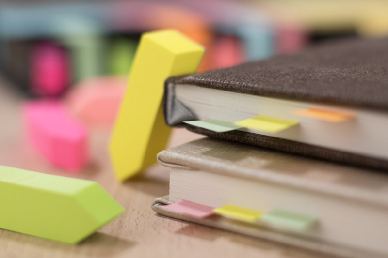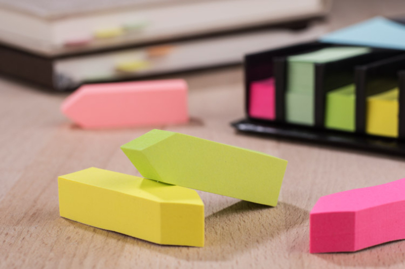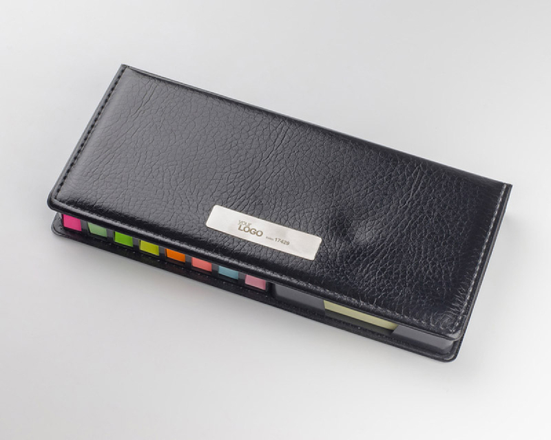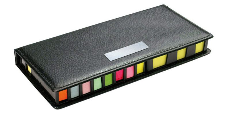 Sada nálepek na paměťové tyče balená v černém etui. Sada obsahuje dva bloky velkého formátu, 2 bloky velkého formátu a 8 malých bloků nálepek na paměťové tyče v různých barvách. Krabice má oddělené místo pro každý blok, takže nálepky na paměťové tyče se nemíchají. Pouzdro má prázdnou stránku pro poznámky. Logo může být vyryto na kovové desce na pouz