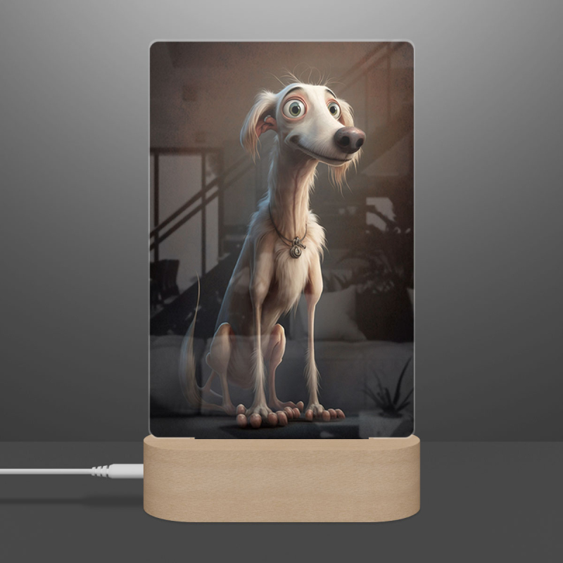 Součástí balení je akrylové sklo dle výběru, dřevěný RGB LED stojánek a napájecí USB kabel.