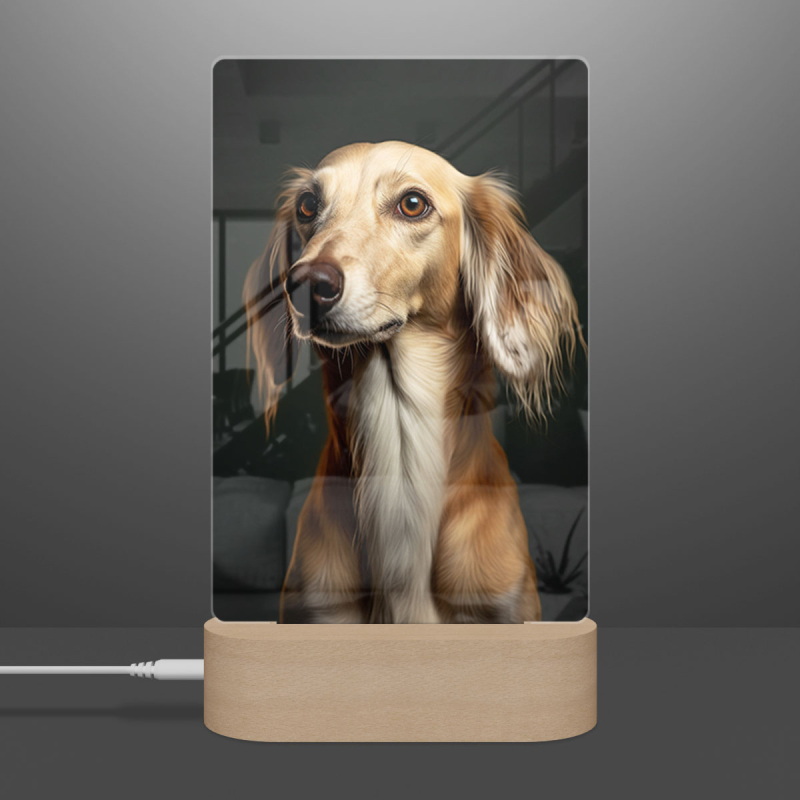 Součástí balení je akrylové sklo dle výběru, dřevěný RGB LED stojánek a napájecí USB kabel.