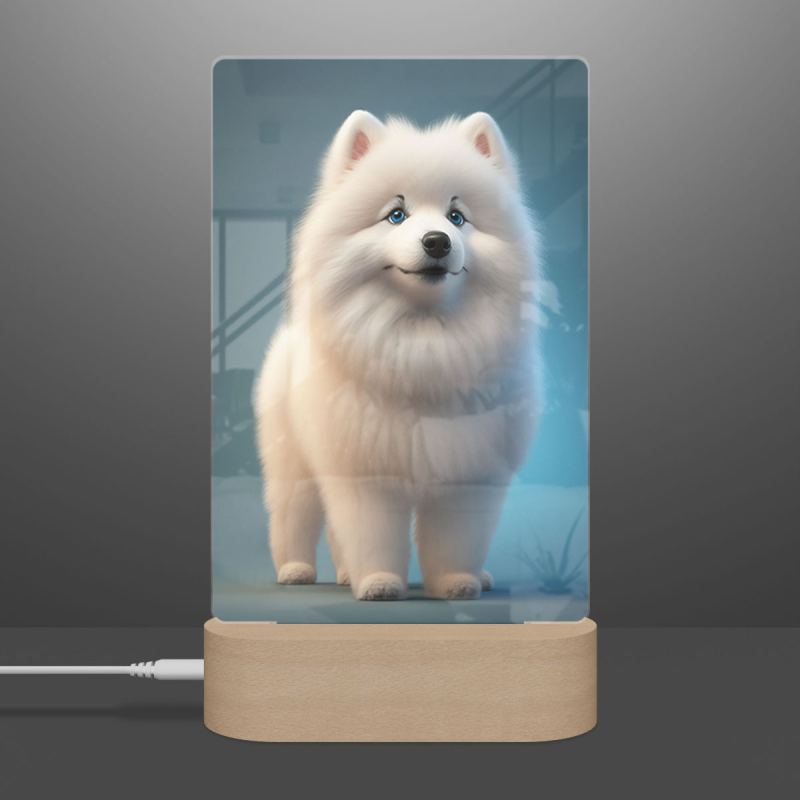 Součástí balení je akrylové sklo dle výběru, dřevěný RGB LED stojánek a napájecí USB kabel.