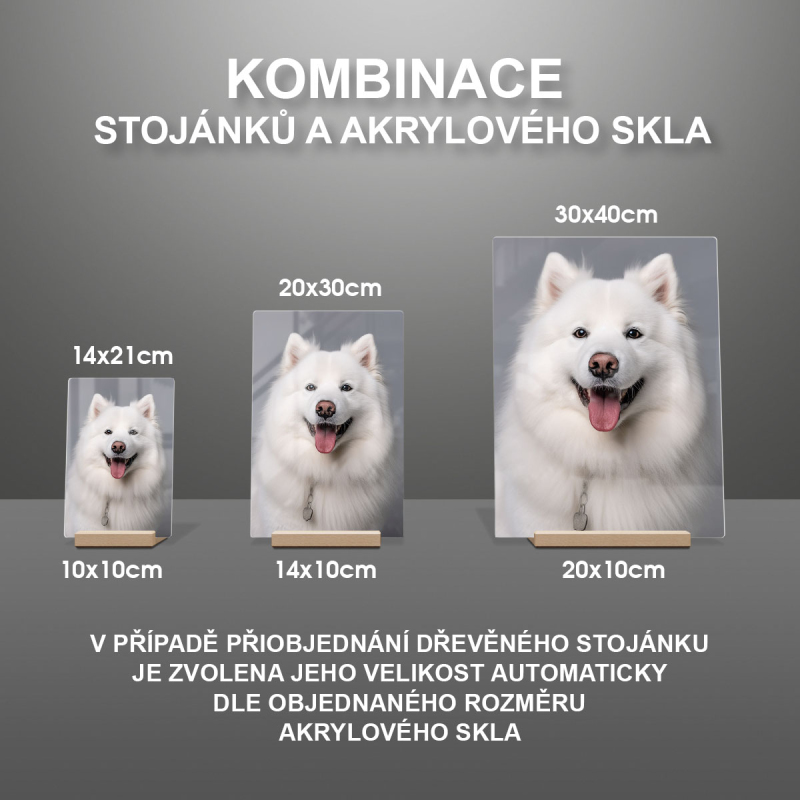 Na produktovém fotu vyobrazena nejoblíbenější varianta akrylového skla 14x21cm a dřevěný stojánek 10x10cm.