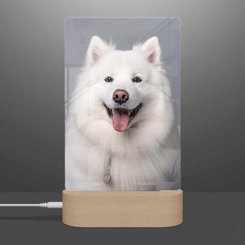 Součástí balení je akrylové sklo dle výběru, dřevěný RGB LED stojánek a napájecí USB kabel.