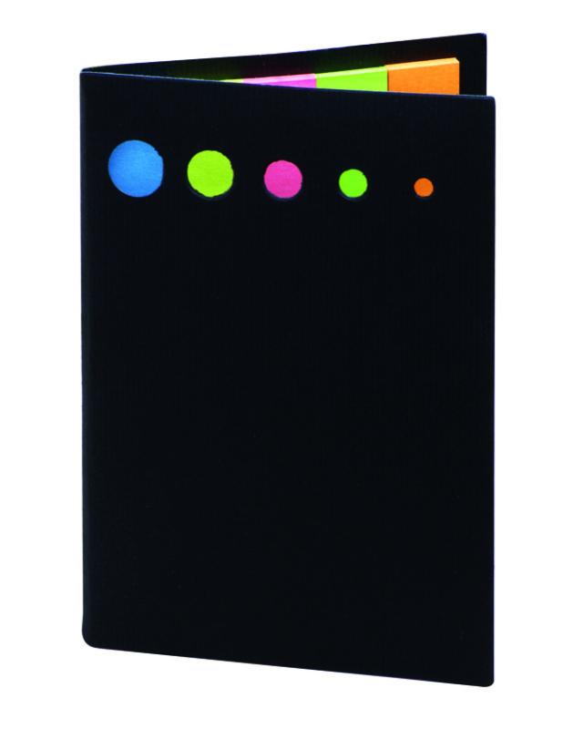 Spojte 5 barevných papírových listů s sebou pomocí sešitu a umístěte je do černého obalu. Logo by mohlo být tisknuto na obal.
