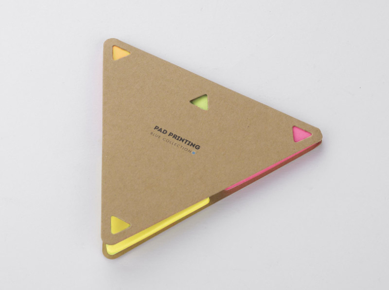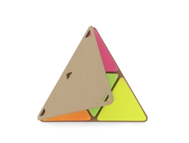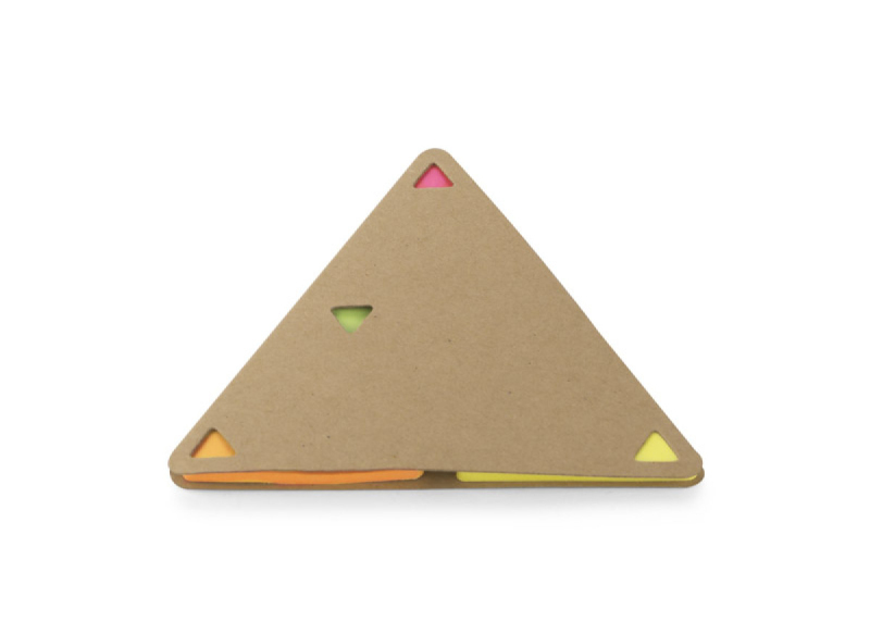 PEL lepící poznámky ve tvaru trojúhelníku s ekologickým papírovým obalem. Uvnitř je 25 kusů listů ve 4 barvách: oranžová, růžová, zelená, žlutá.