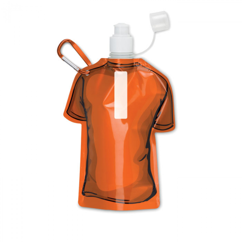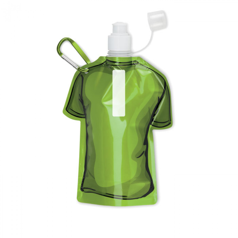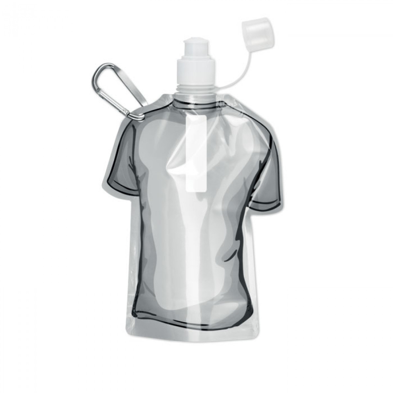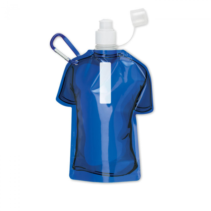 Skládací plastová láhev ve tvaru trička s karabinkou. Neobsahuje BPA. 480 ml.