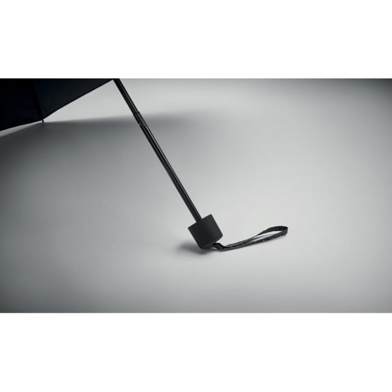 21palcový deštník s ručním otevíráním a zavíráním, odolný proti větru. Materiál: 190T RPET pongee. Součástí je pouzdro na tašku. Má skrytou přihrádku na zip pro uložení deštníku a udržení obsahu tašky v suchu. Když se taška nepoužívá, sroluje se a přihrádka na zip slouží jako obal na deštník.