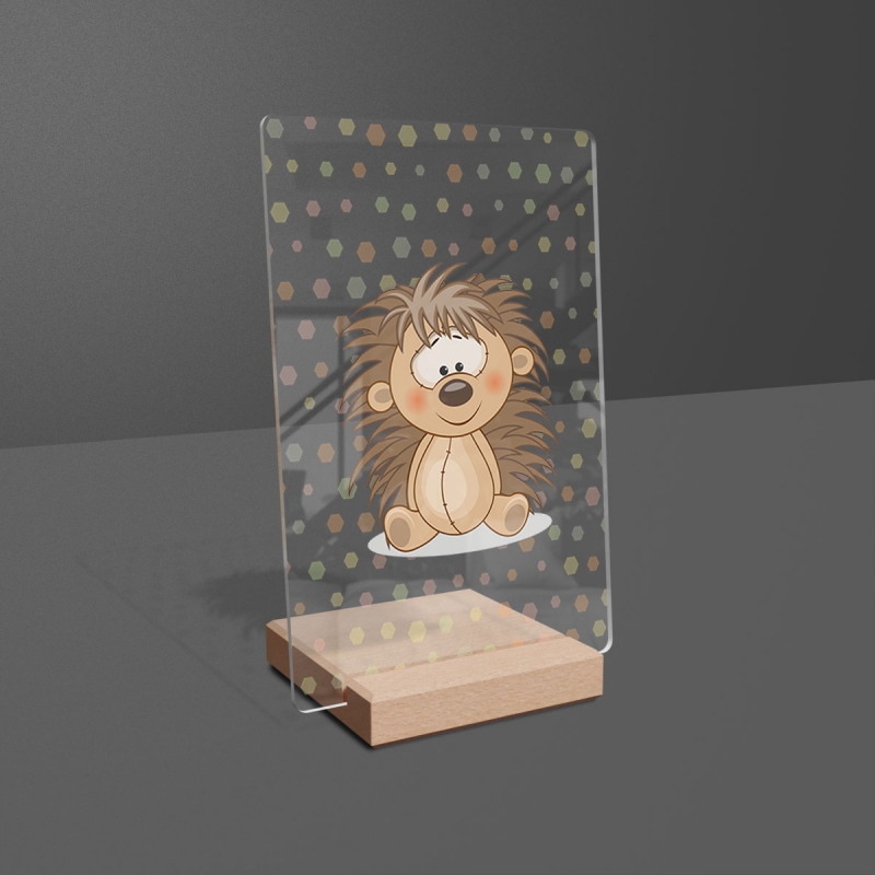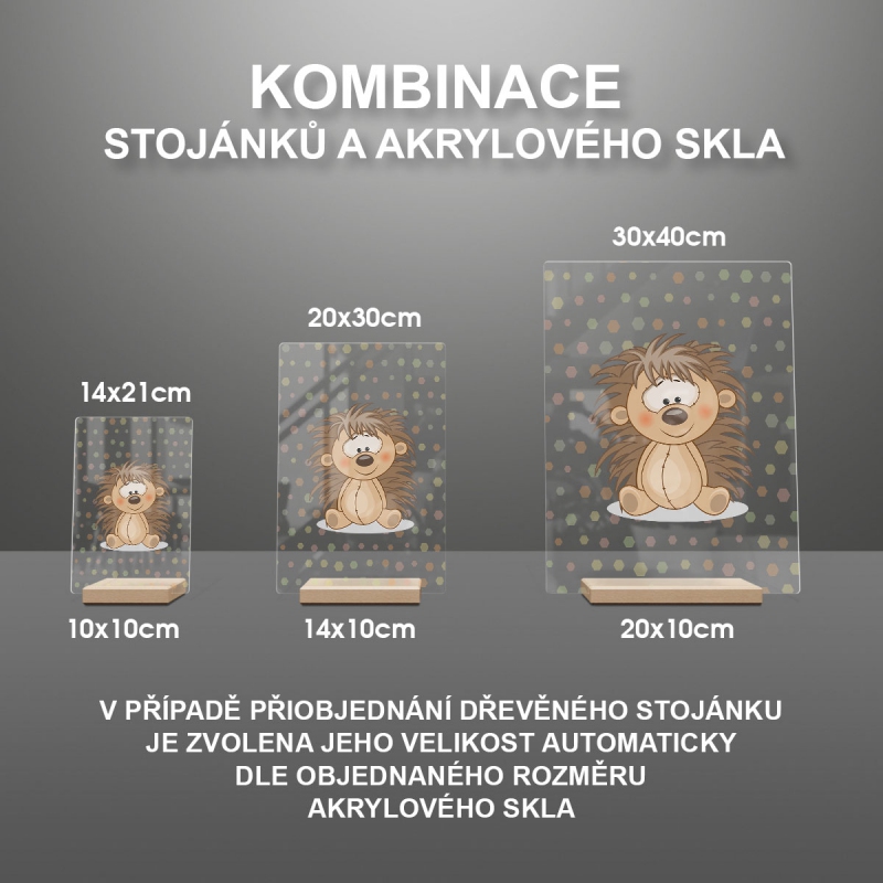 Na produktovém fotu vyobrazena nejoblíbenější varianta akrylového skla 14x21/21x14cm a dřevěný stojánek 10x10cm.