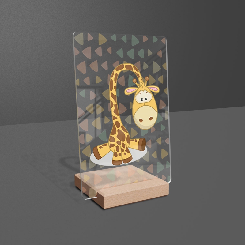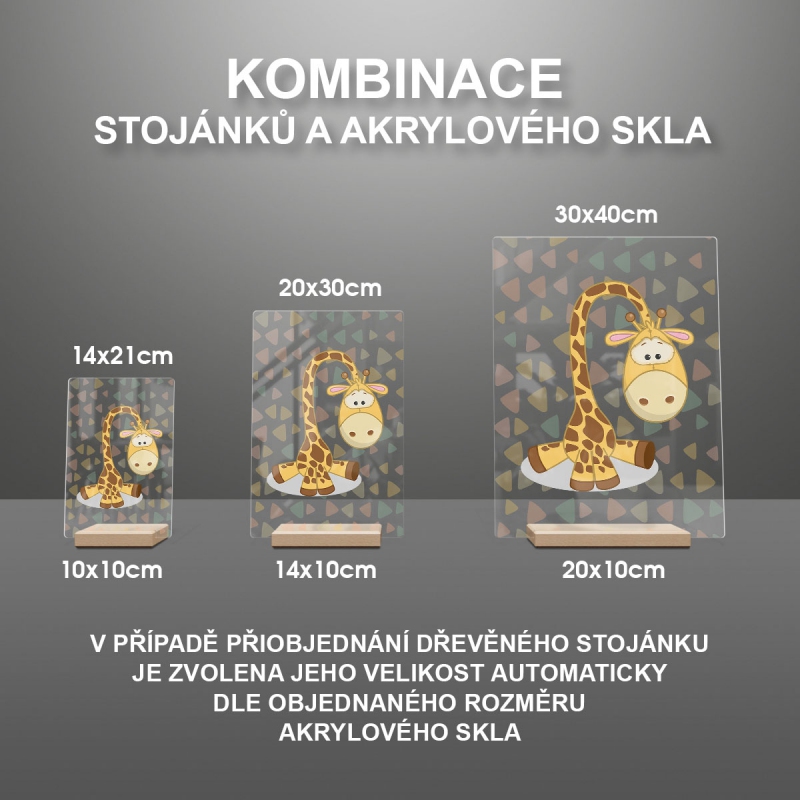 Na produktovém fotu vyobrazena nejoblíbenější varianta akrylového skla 14x21/21x14cm a dřevěný stojánek 10x10cm.