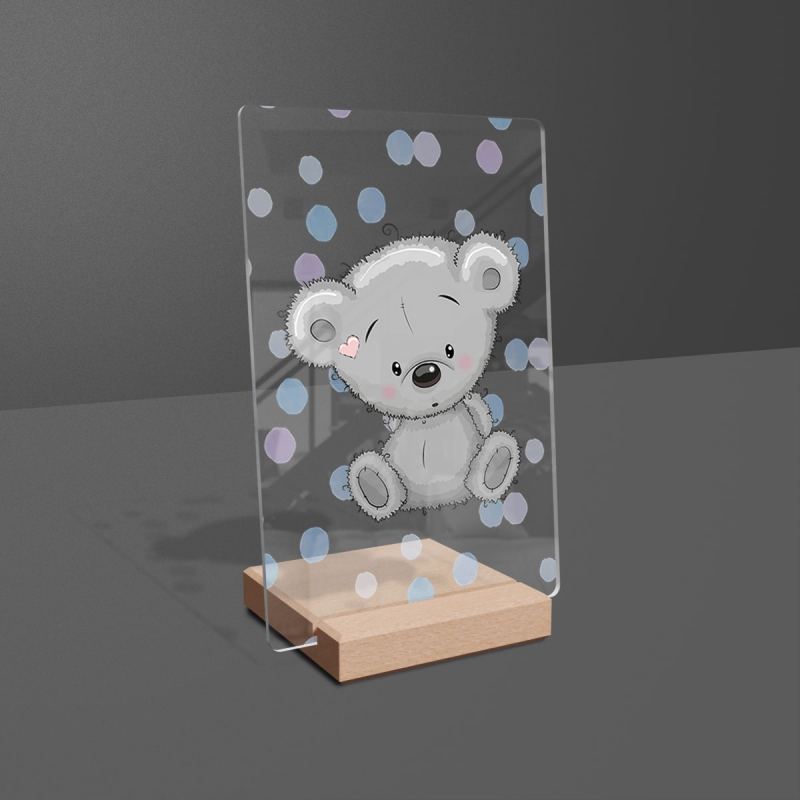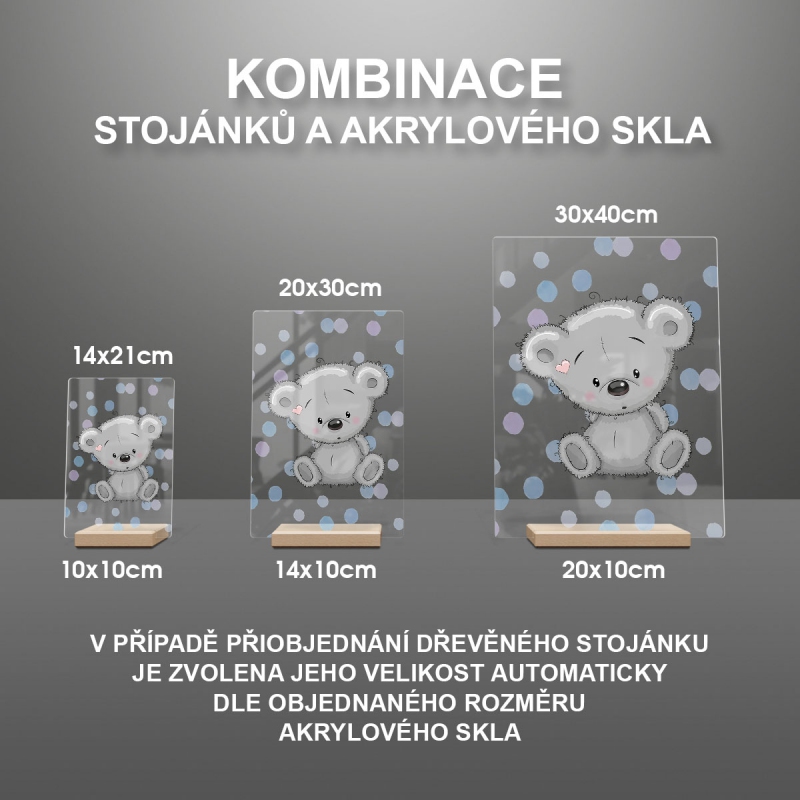 Na produktovém fotu vyobrazena nejoblíbenější varianta akrylového skla 14x21/21x14cm a dřevěný stojánek 10x10cm.