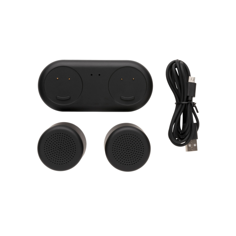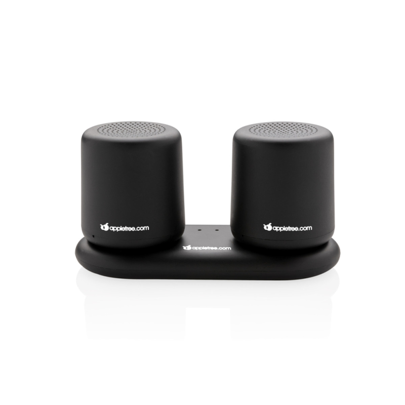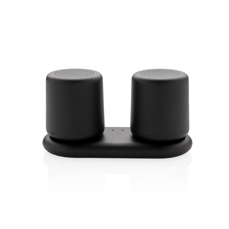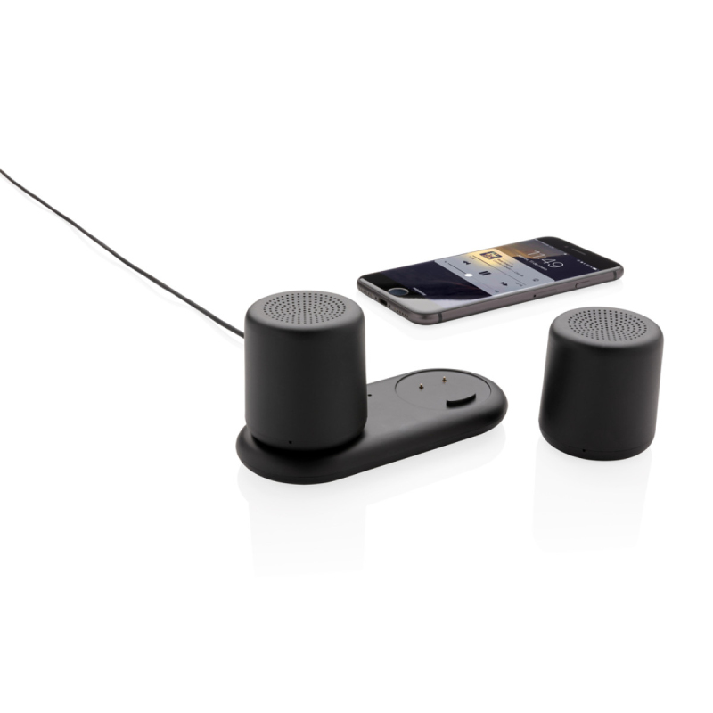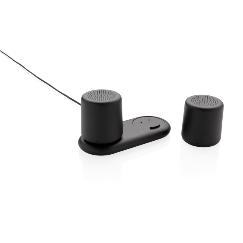 Set dvou 3W reproduktorů pro nenahraditelný stereo hudební zážitek. Reproduktory díky BT 4.2 umístěte kdekoliv v provozní vzdálenosti až 10m od zdrojového zařízení. Nabíjení funguje jednoduše položením reproduktorů na nabíjecí základnu, plně bezdrátově! Oba reproduktory jsou vybaveny 300 mAh baterií umožňující přehrávání po dobu až 2h. Včetně komfortně 1,2m dlouhého kabelu pro připojení nabíjecí základny ke zdroji napájení.
