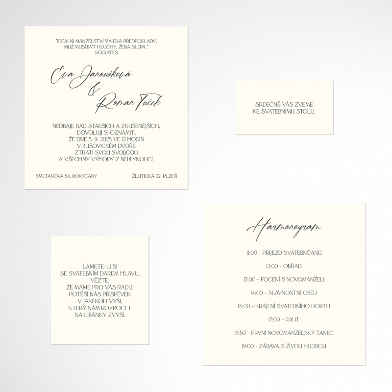 Set vkladových karet vhodných do přebalů svatebních oznámení v rozměru 150x150mm. Tento produkt je možné použít i jako moderní a jednoduché svatební oznámení s dalšími doplňky.