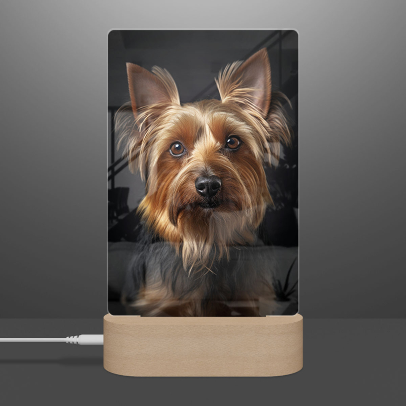 Součástí balení je akrylové sklo dle výběru, dřevěný RGB LED stojánek a napájecí USB kabel.