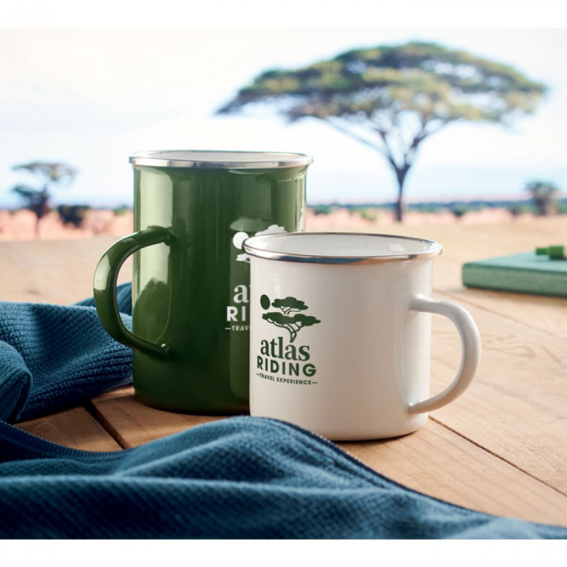 Kovový retro hrnek se smaltovanou vrstvou. Objem: 550 ml.
