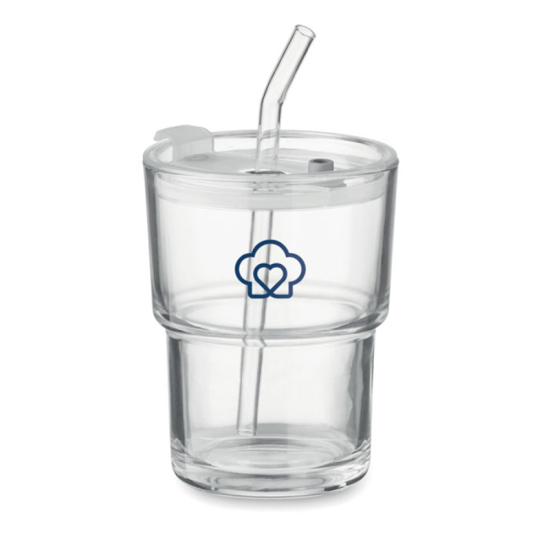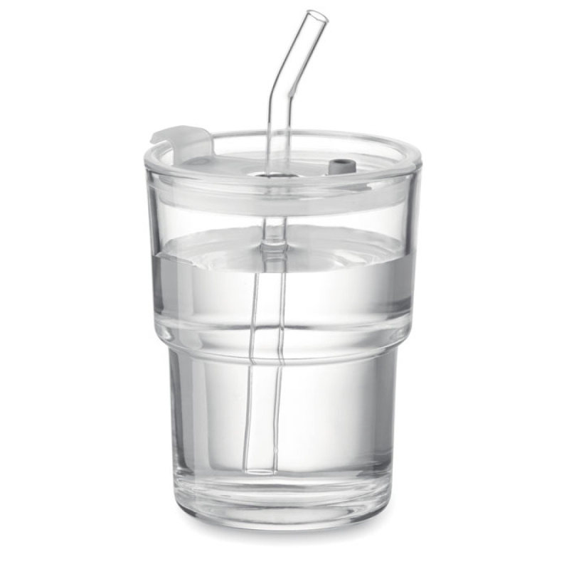 Skleněný pohárek s víčkem a odnímatelným skleněným brčkem. Víčko umožňuje i přímé pití nápoje. Neteče. Objem 300 ml.