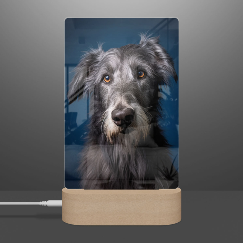 Součástí balení je akrylové sklo dle výběru, dřevěný RGB LED stojánek a napájecí USB kabel.