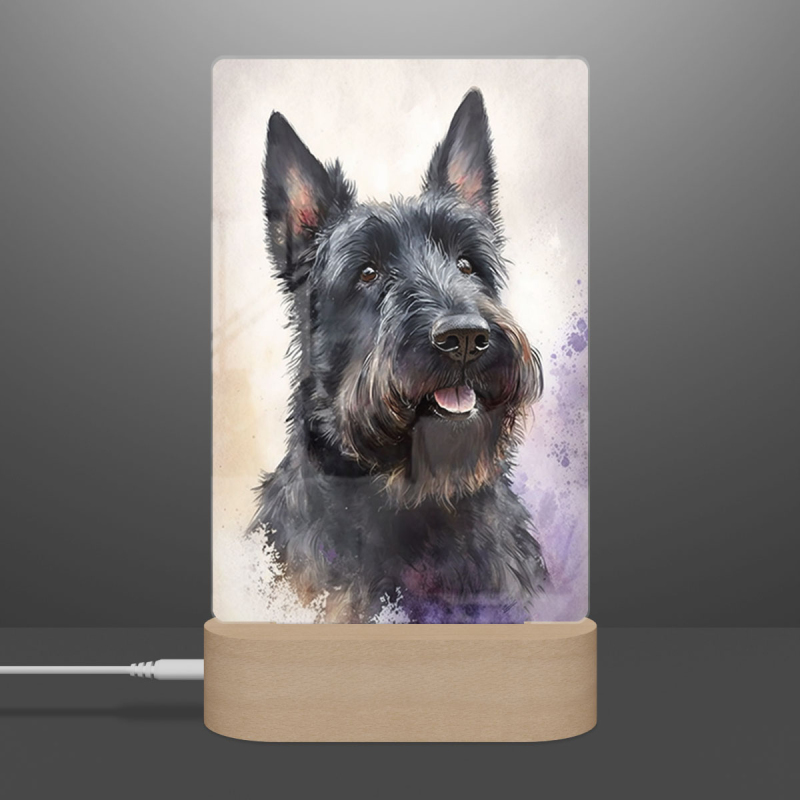 Součástí balení je akrylové sklo dle výběru, dřevěný RGB LED stojánek a napájecí USB kabel.