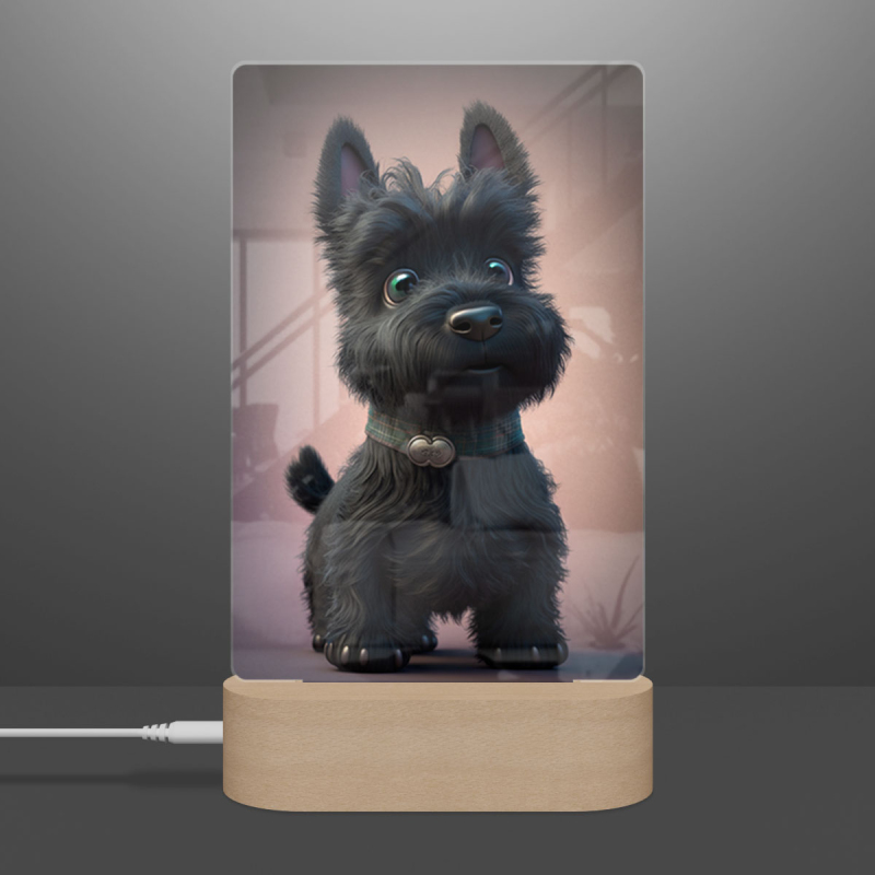 Součástí balení je akrylové sklo dle výběru, dřevěný RGB LED stojánek a napájecí USB kabel.