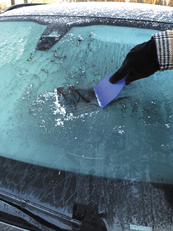 Škrabka na led z částečně průhledného PS. Koncová tloušťka škrabky: 0.6cm.
