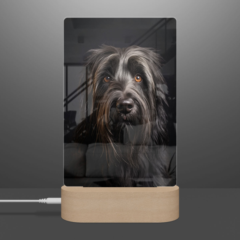Součástí balení je akrylové sklo dle výběru, dřevěný RGB LED stojánek a napájecí USB kabel.