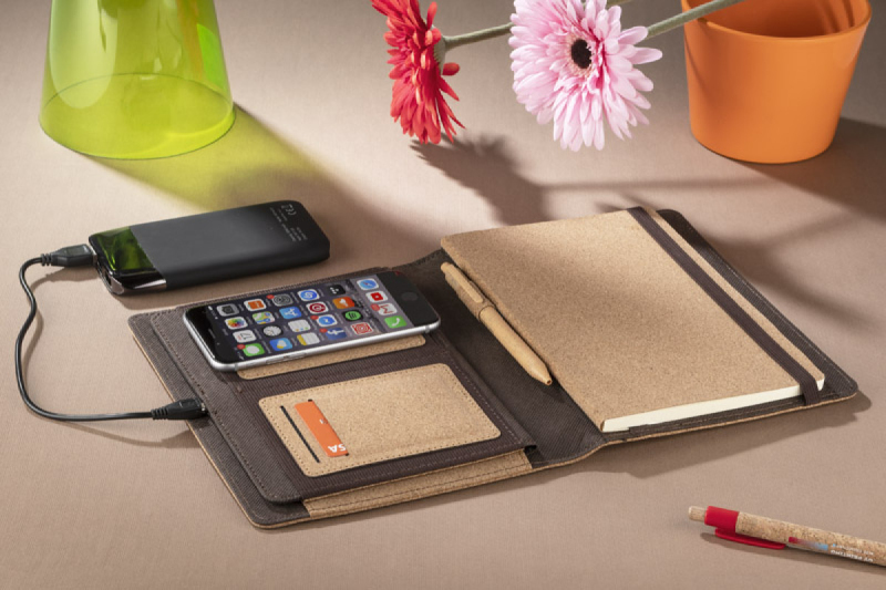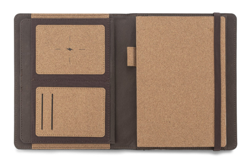 Aktovka CHARCO je produktem spojujícím pohodlnost během použití s přírodním design. Vestavěná indukční nabíječka, velikost A5, 1 velká kapsa, 2 elastické přihrádky, 2 kapsy na vizitky nebo kreditní karty, držák na pero, odnímatelný notebook s podšívkou A5. Sada obsahuje také kabel pro propojení indukční nabíječky. Desky jsou vyrobené z přírodního korku. Aktovka se uzavírá pomocí gumičky. Zabalená do elegantní, jednoduché papírové krabici.