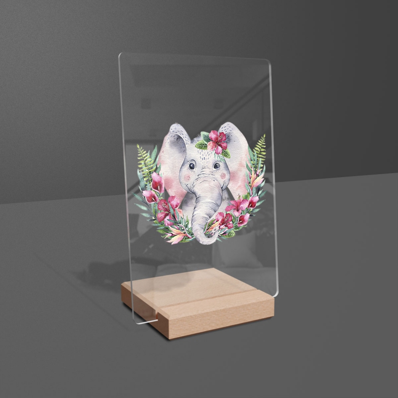 Na produktovém fotu vyobrazena nejoblíbenější varianta akrylového skla 14x21/21x14cm a dřevěný stojánek 10x10cm.