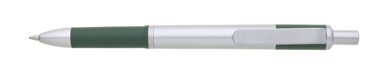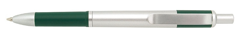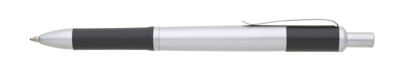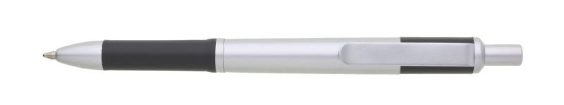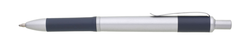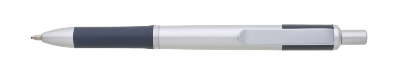 Propiska s matným stříbrným tělem a doplňky má tmavě modrý úchyt a zadní část těla. Náplň X20, modře píšící.