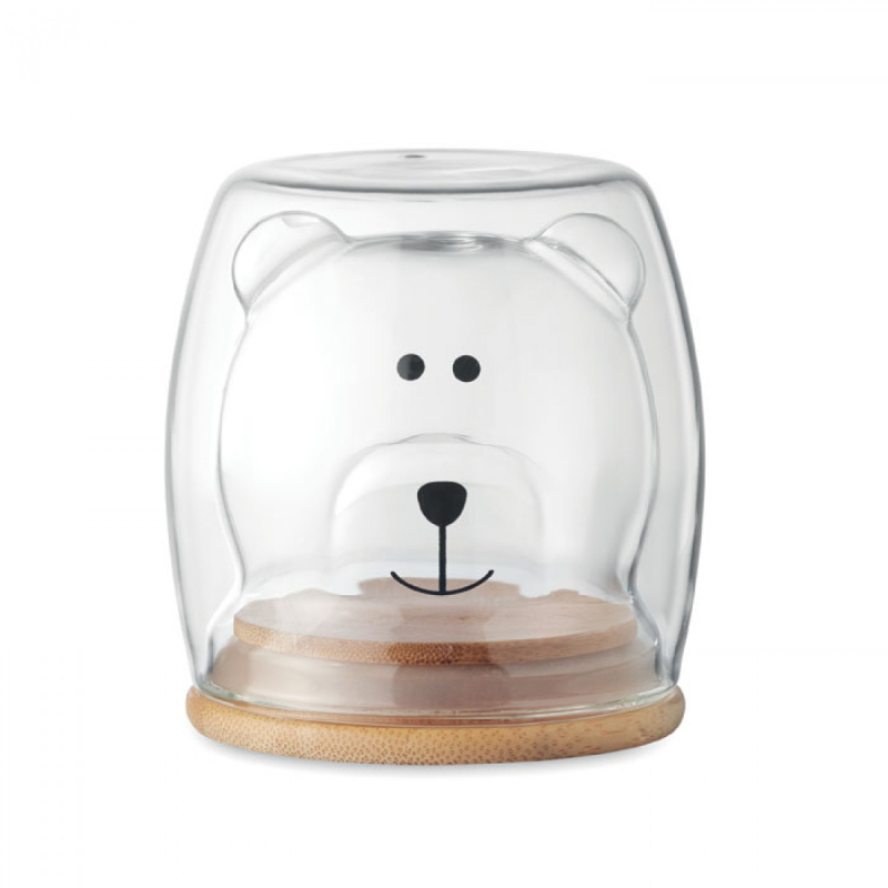 Dvoustěnný borosilikátový hrnek s vnitřním tvarem medvědí hlavy a bambusovým víčkem. Objem: 260 ml.