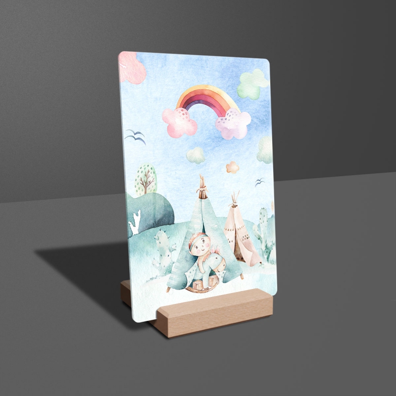 Na produktovém fotu vyobrazena nejoblíbenější varianta akrylového skla 14x21/21x14cm a dřevěný stojánek 10x10cm.