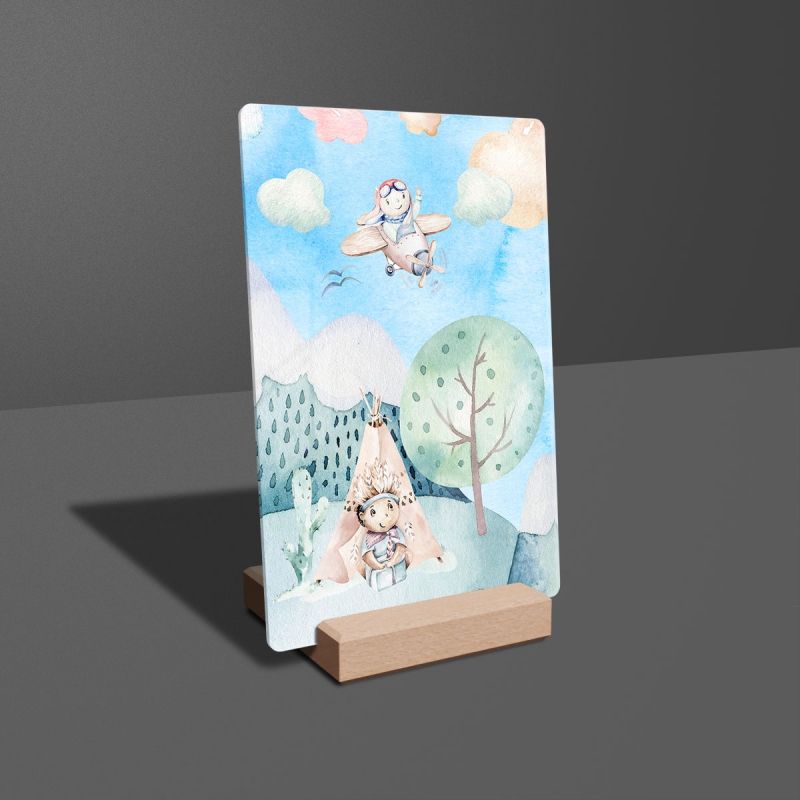 Na produktovém fotu vyobrazena nejoblíbenější varianta akrylového skla 14x21/21x14cm a dřevěný stojánek 10x10cm.