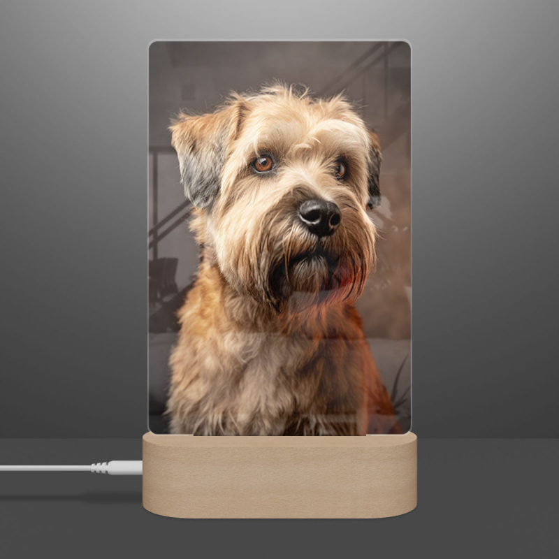 Součástí balení je akrylové sklo dle výběru, dřevěný RGB LED stojánek a napájecí USB kabel.