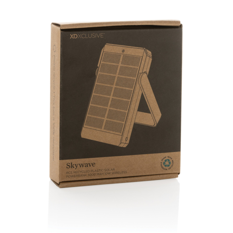Powerbanka s kapacitou 5 000 mAh s možností solárního nabíjení. Využívá vysoce kvalitní monokrystalické solární panely s konverzním poměrem 19 %. Rychlost solárního nabíjení: 5V/130 mA. Stupeň nabíjení vždy závisí na slunečních podmínkách. Integrovaný stojánek pro nastavení ideálního úhlu. Včetně 10 W bezdrátového nabíjení. Vyrobené z RCS recyklovaného ABS. RCS (Recycled Claim Standard) je globální standard, který umožňuje ověřit použití recyklovaného materiálu v produktu napříč celým dodavatelským řetězcem. Celkový podíl recyklátu dle váhy produktu: 21 %. Včetně nabíjecího kabelu z RCS recyklovaného TPE. Baleno v FSC dárkovém balení. Vstup USB C: 5V/2A. Výstup: USB A: 5V/2A; USB C: 5V/2A. Ochranný vzor®.