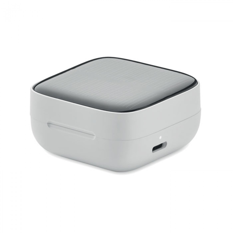 Bezdrátová sluchátka TWS 5.3 z ABS s mikrofonem a 30 mAh baterií. Doba přehrávání přibližně 4 hodiny. Solární nabíjení a automatické párování. Nabíjecí kabel typu C a nabíjecí stanice s kapacitou 200 mAh.