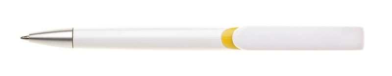 Kuličkové pero SORA je plastové, má bílé tělo se žlutým doplňkem pod klipem a stříbrnou špičkou. Náplň- X-20, modře píšící.