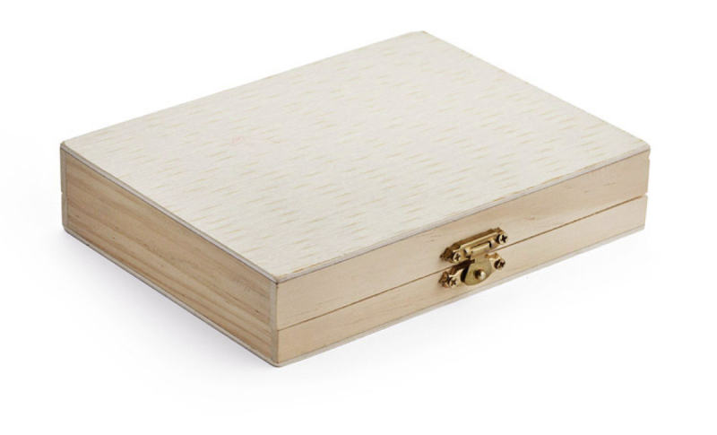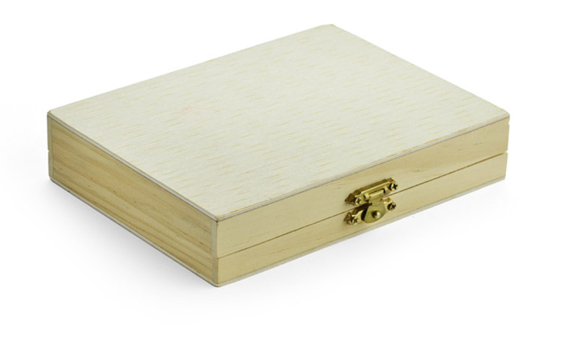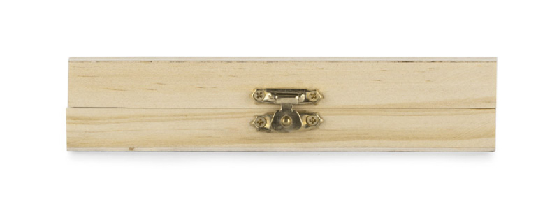 Praktická sada v dřevěné krabičce obsahující: tužku, gumu, tužkový ořezávač, pastelky a barvy s štětcem. Mohli bychom vyryt logo na krabici.