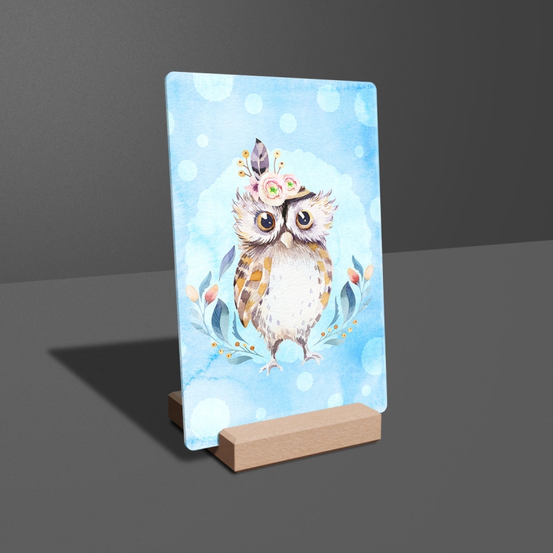 Na produktovém fotu vyobrazena nejoblíbenější varianta akrylového skla 14x21/21x14cm a dřevěný stojánek 10x10cm.