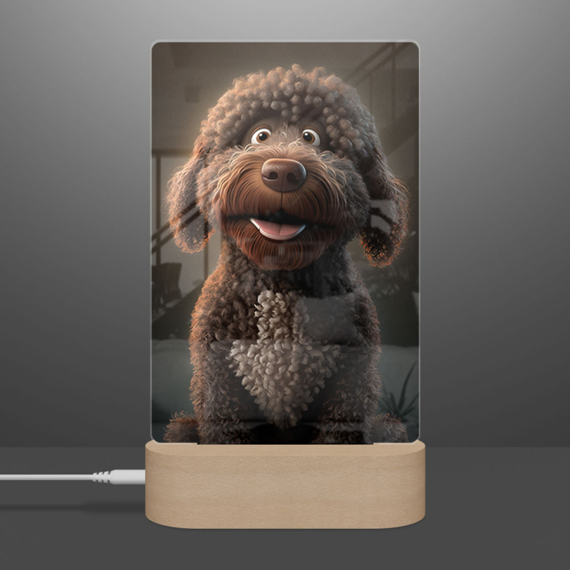 Součástí balení je akrylové sklo dle výběru, dřevěný RGB LED stojánek a napájecí USB kabel.