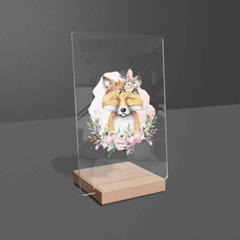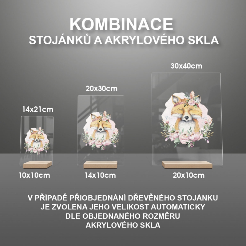 Na produktovém fotu vyobrazena nejoblíbenější varianta akrylového skla 14x21/21x14cm a dřevěný stojánek 10x10cm.